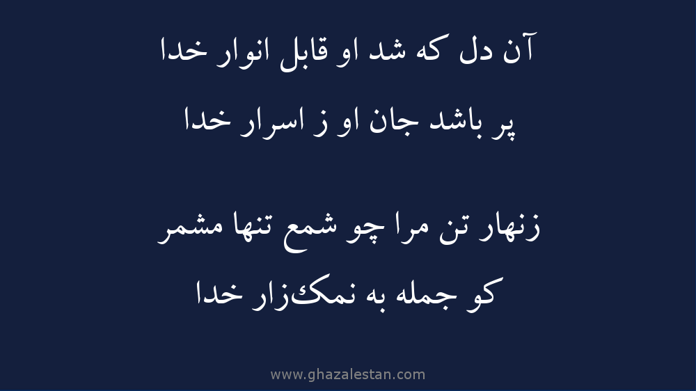 زنهار تن خودت تو تن ها مَشمُر/کاو جمله نمک شد به نمکزار خدا