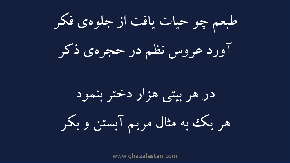 طبعم یعنی چهار بُعد من به خدا زنده شد وقتی این من ذهنی جلوه گر کنار رفت ،من زنده شدم معشوق به عروس نظم تشبیه شده این ابیات هم وصف زیبایی معشوق من است و این بیت ها بکر هست واز عالم بالا آورده.شده به مثال مریم که آبستن به مسیح است یعنی میخواد بگه این ابیات زنده کننده هستن ( مرده بدم زنده شدم ) بدلیل اینکه در وصف معشوق لایتناهی است
